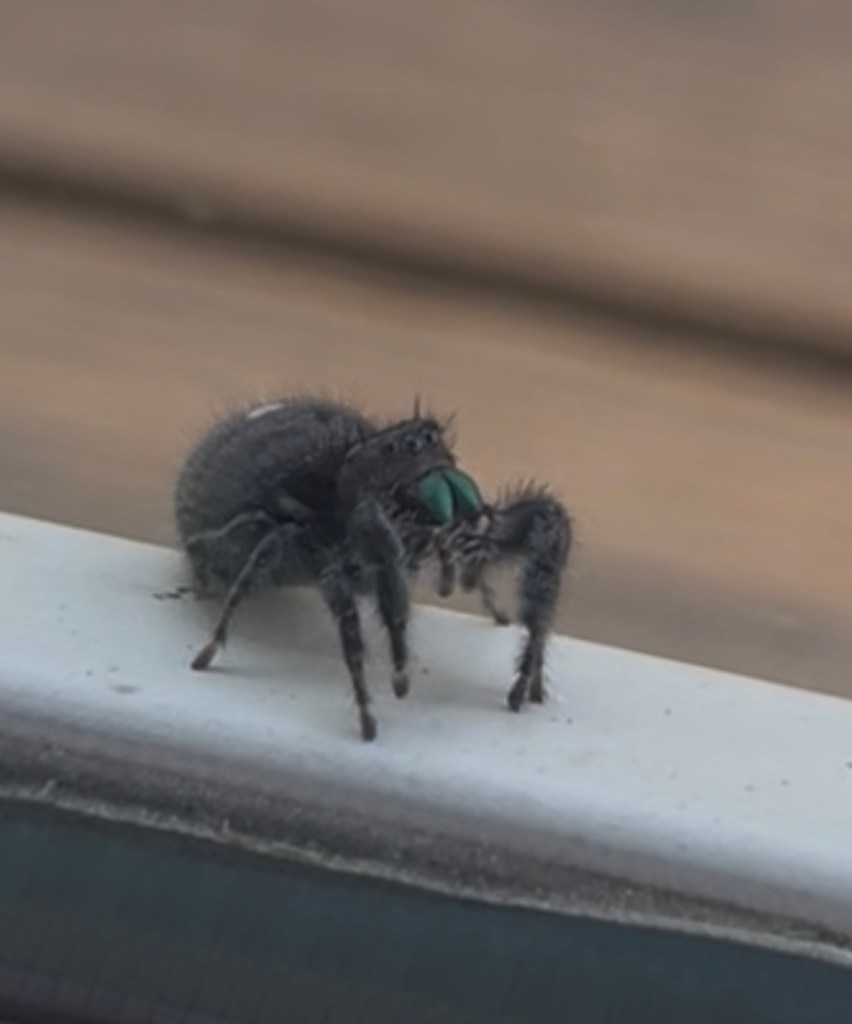 It clicked its legs, fangs rubbing together. Emerald markings glinted in the sun; its eyes fixed upon me on the other side of the glass. It began climbing up the door toward the door handle.